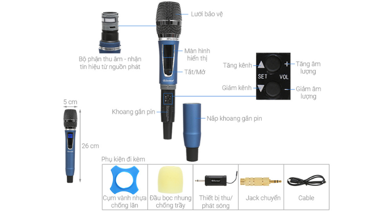 – Sử dụng băng tần UHF hiện đại, đảm bảo kết nối tín hiệu ổn định, phạm vi hoạt động lên đến 50m.