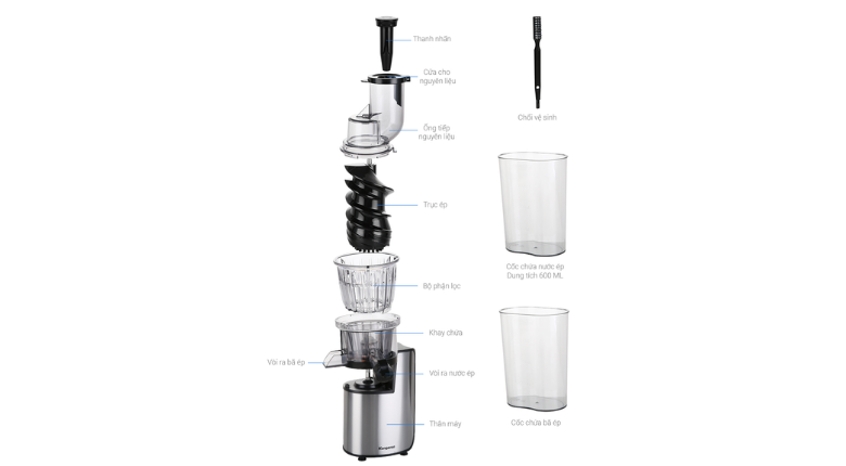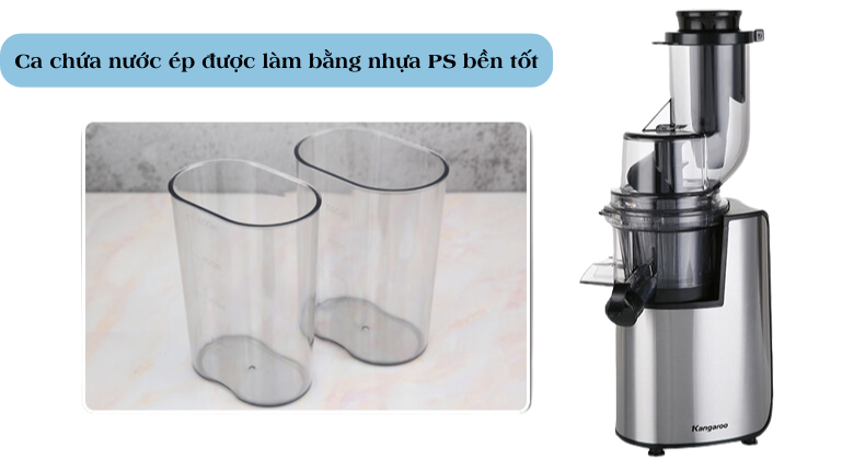 Ca chứa nước ép được làm bằng nhựa PS bền tốt, kháng vỡ và dễ dàng chùi rửa. Dung tích của ca chứa nước và bã ép là 0.6 lít, giúp bạn có thể lưu trữ nhiều nước và bã cùng lúc.