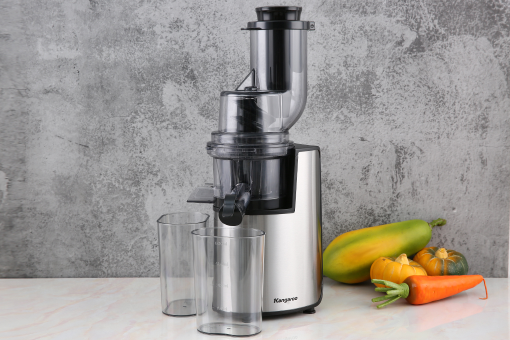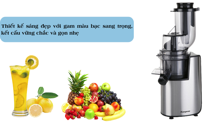 Máy ép chậm Kangaroo có thiết kế sáng đẹp với gam màu bạc sang trọng, kết cấu vững chắc và gọn nhẹ, phù hợp để đặt trên kệ bếp hoặc bàn ăn.