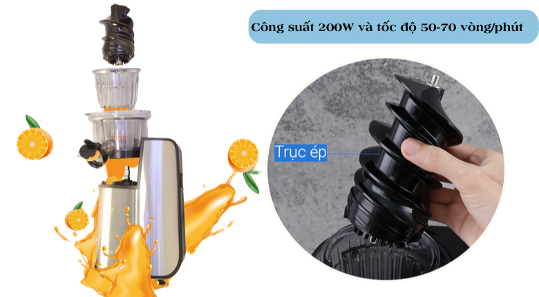 Máy ép chậm Kangaroo được trang bị động cơ ép và trục ép cao cấp, vận hành êm ái với công suất 200W và tốc độ 50-70 vòng/phút. Điều này giúp máy ép kiệt nước và bã khô, cung cấp lượng lớn nước ép.