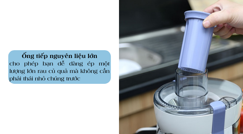 Máy có ống tiếp nguyên liệu lớn, cho phép bạn dễ dàng ép một lượng lớn rau củ quả mà không cần phải thái nhỏ chúng trước.