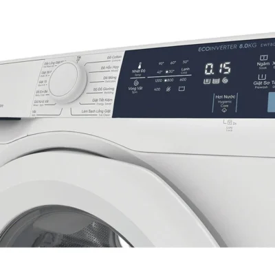 Máy giặt Electrolux 8Kg lồng ngang Inverter EWF8024D3WB có thiết kế cửa ngang hiện đại, vỏ trắng đơn giản, dễ dàng kết hợp với mọi kiểu không gian nội thất. Hiển thị thông số và các chương trình giặt bằng tiếng Việt, giúp người dùng dễ dàng thao tác, sử dụng máy.
