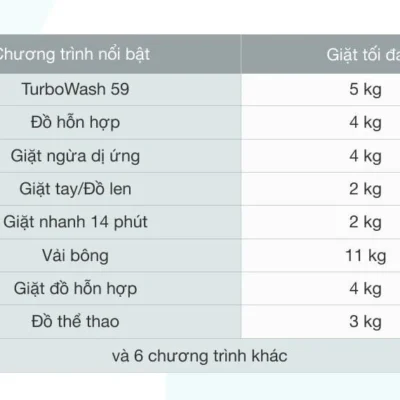 Chu trình tải về TurboWash 59 Đồ Cotton+ Giặt chăn ga Giặt ngừa dị ứng Giặt nhanh 14 phút Giặt nhẹ Giặt tay + đồ len Giặt êm Vệ sinh lồng giặt Đồ cotton Đồ hỗn hợp Đồ thể thao Đồ tinh xảo |
