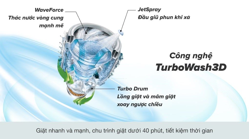 Công nghệ giặt TurboWash 3D không chỉ mang đến khả năng giặt sạch với thác nước vòng cung áp lực mạnh mẽ mà nó còn góp phần giúp bạn tiết kiệm thời gian giặt giũ cho bạn.