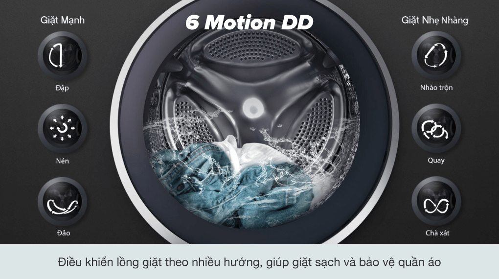 Máy giặt LG này sử dụng ứng dụng công nghệ 6 chuyển động DD được mô phỏng quy trình giặt giống như bàn tay con người, điều khiển lồng giặt một cách linh hoạt để làm sạch quần áo hiệu quả mà vẫn giảm thiểu sự hư tổn của sợi vải đồng thời giảm mức độ xoắn rối của quần áo sau khi giặt.