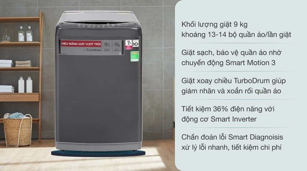 LG Inverter T2109VSAB sở hữu khối lượng giặt 9 Kg, đáp ứng cho nhu cầu làm sạch quần áo với số lượng nhiều trong mỗi lần giặt, phù hợp với những gia đình có từ 3 – 5 người.