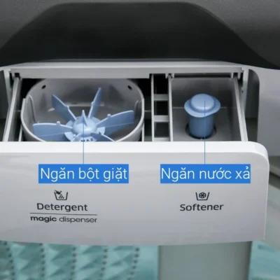 Hộp đánh tan bột giặt Magic Dispenser trên máy giặt Samsung có một cánh quạt xoay, kết hợp với tia nước mạnh mẽ, sẽ đánh tan bột giặt trước khi theo dòng nước đi vào lồng giặt. Như vậy sẽ không còn tình trạng cặn bột giặt bám lại trên quần áo, quần áo của bạn được giặt sạch sẽ tinh tươm.