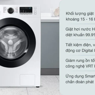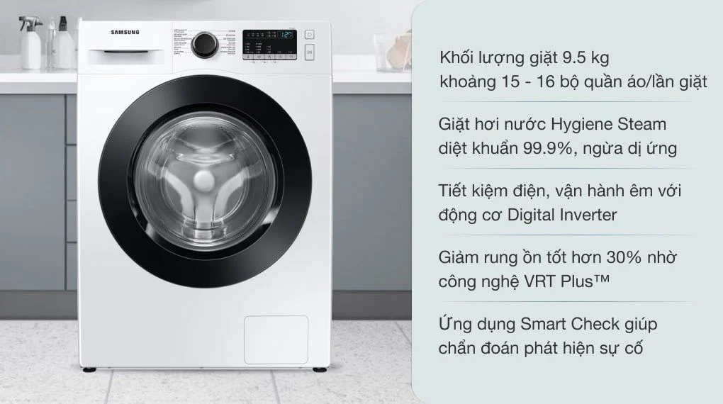 Ngoài ra, máy giặt Samsung với khối lượng giặt 9.5 kg giúp bạn an tâm trong việc, đáp ứng nhu cầu giặt lượng quần áo lớn của gia đình từ 5 – 7 thành viên.