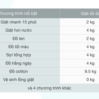 Bên cạnh đó máy giặt còn được tích hợp sẵn 8 chương trình giặt nổi bật bao gồm: giặt nhanh 15 phút, giặt hơi nước, đồ len, đồ tối màu, sợi tổng hợp, đồ hằng ngày, đồ cotton, vệ sinh lồng giặt và 4 chương trình khác (xem chi tiết tại bảng thông số kỹ thuật). Chương trình giặt nhanh 15 phút giúp bạn tiết kiệm thời gian cho việc giặt giũ (phù hợp với các loại đồ ít bẩn).