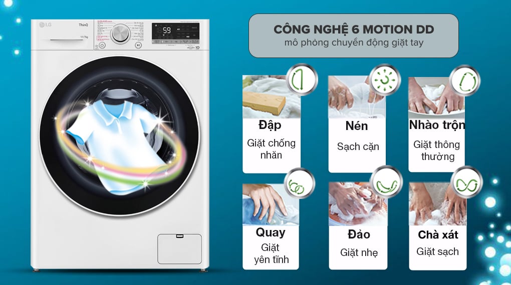 – Công nghệ 6 Motion DD: mô phỏng theo bàn tay của con người kết hợp với động cơ của máy giặt LG, giúp lồng giặt chuyển động theo hướng cùng tốc độ quay linh hoạt để nhào trộn, chà xát, nén, quay, đập và đảo quần áo, nhờ đó giúp loại bỏ vết bẩn được hiệu quả và giảm thiểu tình trạng xoắn rối quần áo sau khi giặt.