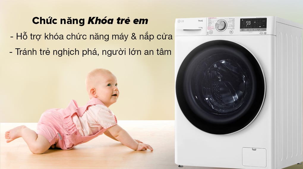 – Khóa trẻ em: hỗ trợ người lớn khóa các chức năng trên máy và nắp cửa của máy giặt để tránh trẻ nhỏ nghịch phá khi không có người lớn ở nhà, đồng thời đảm bảo cho máy giặt được vận hành ổn định cũng như không làm ảnh hưởng đến thời gian giặt giũ.