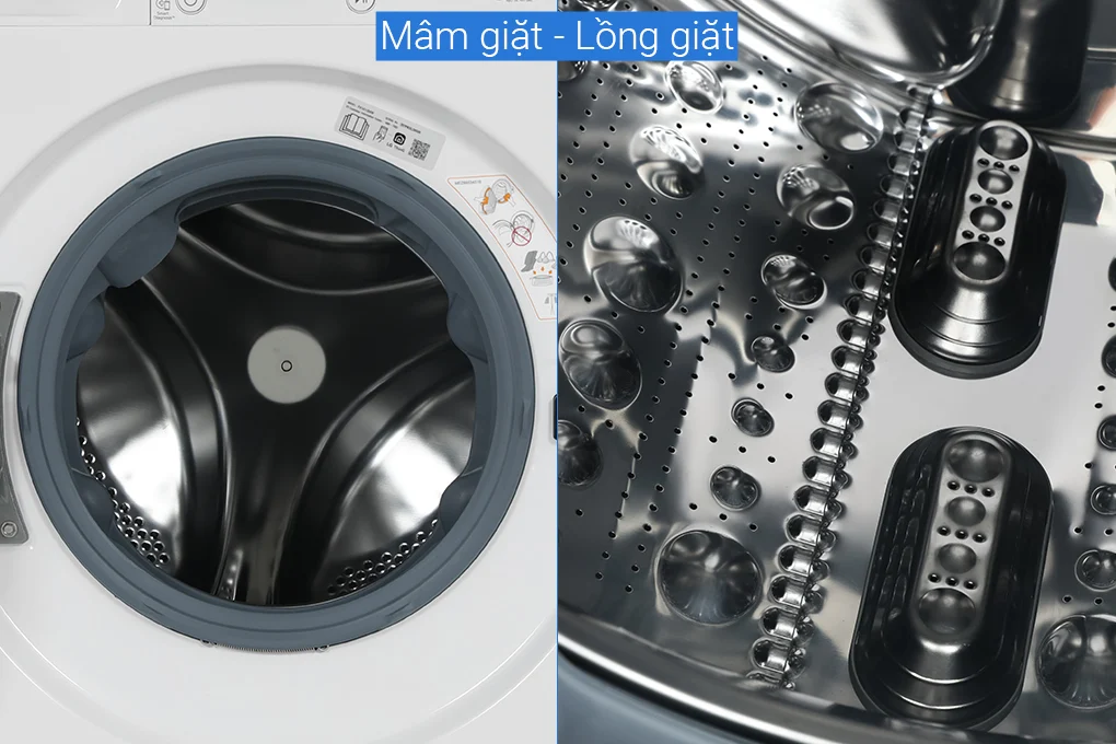 – Trên bề mặt lồng giặt còn được thiết kế nhiều lỗ phun nước với các gờ nổi, kết hợp với thanh mâm giặt được thiết kế to, hỗ trợ việc nhào trộn và đánh bay vết bẩn bám trên quần áo dễ dàng hơn.