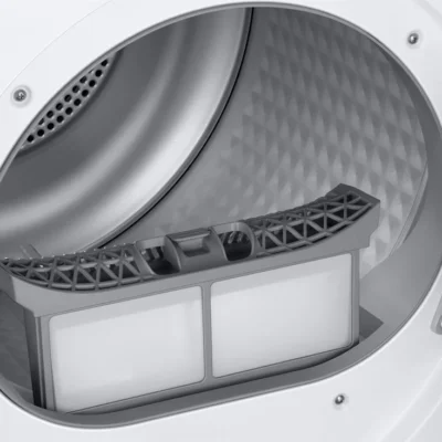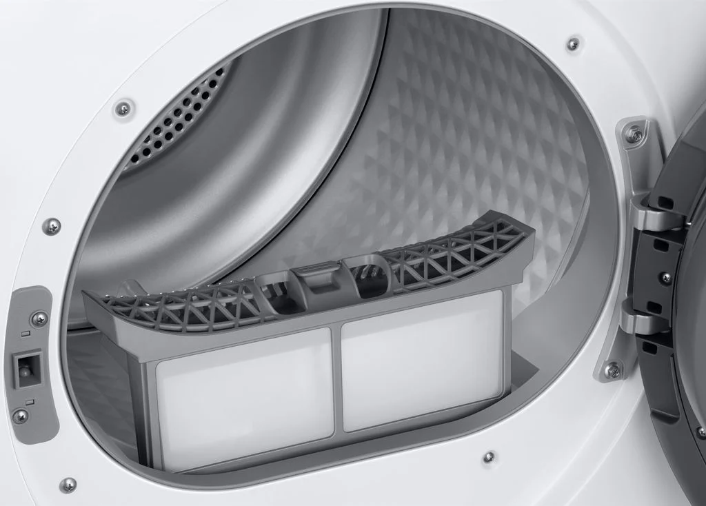 Máy sấy bơm nhiệt Samsung 9 kg DV90TA240AE/SV thiết kế bộ lọc gồm 2 màng lọc thép có tác dụng lọc sạch xơ vải, bụi bẩn và dễ dàng vệ sinh.