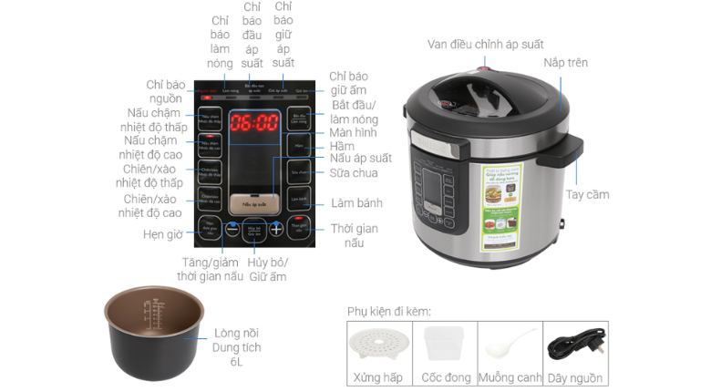 Với nhiều chức năng nấu đa dạng như nấu cơm, giữ ấm, nấu chậm ở nhiệt độ thấp, nấu chậm ở nhiệt độ cao, hầm, làm sữa chua và làm bánh, nồi áp suất là một trợ thủ đắc lực giúp bạn hoàn thiện những món ăn ngon một cách dễ dàng. Nó là một người bạn đáng tin cậy của người nội trợ.