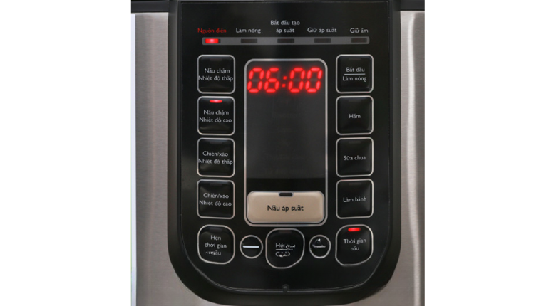 Bảng điều khiển của nồi áp suất được thiết kế với nút nhấn điện tử và màn hình hiển thị hiện đại, cung cấp tiếng Việt và giao diện dễ sử dụng, thích hợp cho mọi đối tượng người dùng.
