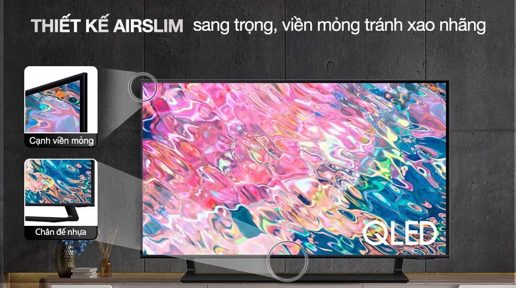 – Smart Tivi QLED 4K 43 inch Samsung QA43Q60B được thiết kế với những đường nét cứng cáp nhưng không thô cứng, màn hình siêu mỏng, chân đế chữ L thanh mảnh, chắc chắn, tổng thể hài hòa quyện với mọi không gian. Cạnh viền mỏng giúp người dùng thưởng thức những khung hình không giới hạn.
