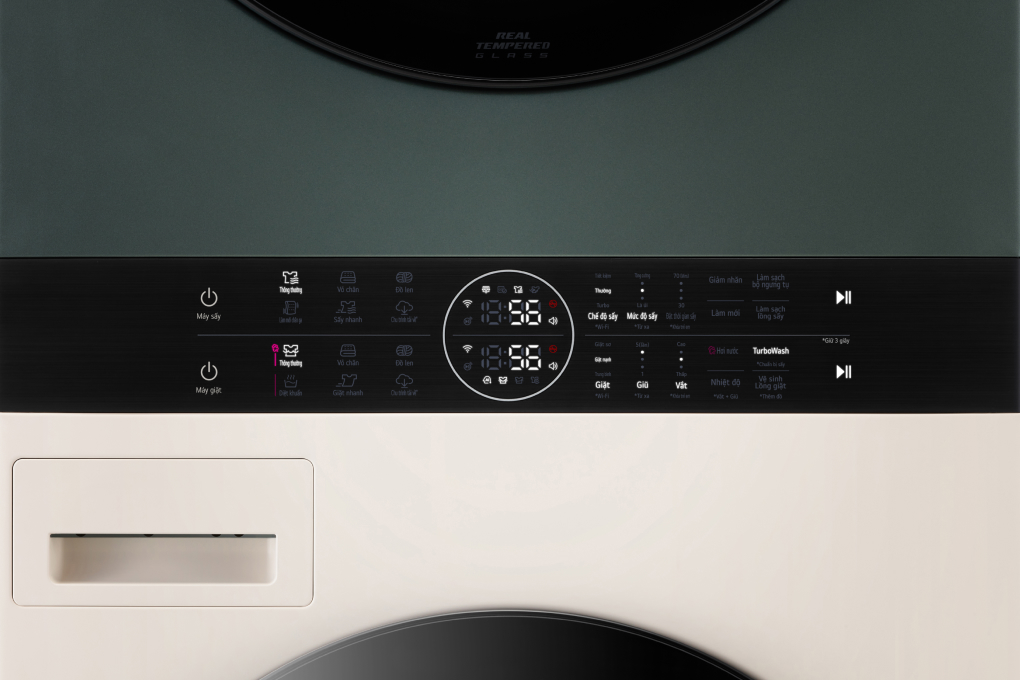 – Bảng điều khiển nằm ở vị trí trung tâm của tháp máy giặt sấy giúp người dùng thuận tiện tuỳ chỉnh các thông số giặt và sấy với màn hình hiển thị sắc nét.
