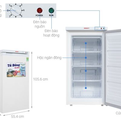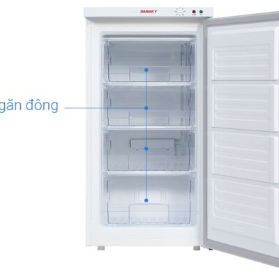 Tủ đông đứng Sanaky được thiết kế 1 ngăn đông dạng đứng với 1 cánh mở, có thiết kế nhỏ gọn, lớp sơn màu trắng sang trọng, giúp tủ có thể hài hòa với không gian người dùng một cách dễ dàng mà không tốn nhiều diện tích.