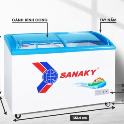 Tủ đông Sanaky có cấu trúc chắc chắn với cửa tủ làm từ kính chịu lực, lòng tủ bằng nhôm sơn tĩnh điện. Sanaky VH-4899K thiết kế dạng tủ ngang, có 2 cánh kính cong lùa, kính trong suốt dễ quan sát vào trong.