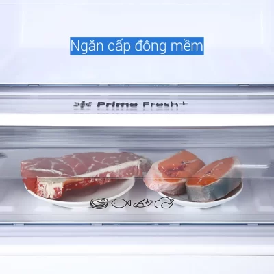 Tủ lạnh Panasonic được trang bị ngăn đông mềm thế hệ mới Prime Fresh+ với mức nhiệt độ chuẩn -3 độ C, giúp thực phẩm không bị đông đá hoàn toàn mà chỉ hình thành một lớp băng mỏng trên bề mặt, sẵn sàng để chế biến ngay mà không cần rã đông.