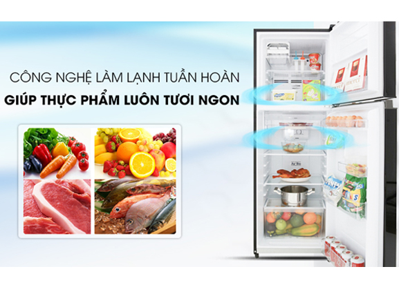Tủ lạnh Toshiba Inverter có trang bị công nghệ làm lạnh tuần hoàn, đảm bảo khí lạnh luôn được cung cấp toàn diện, xuyên suốt trong quá trình hoạt động và luân chuyển các luồng khí lạnh tươi mát đến mọi vị trí, giữ cho thực phẩm tươi ngon lâu hơn ngay cả khi tủ đã chứa đầy dung tích.