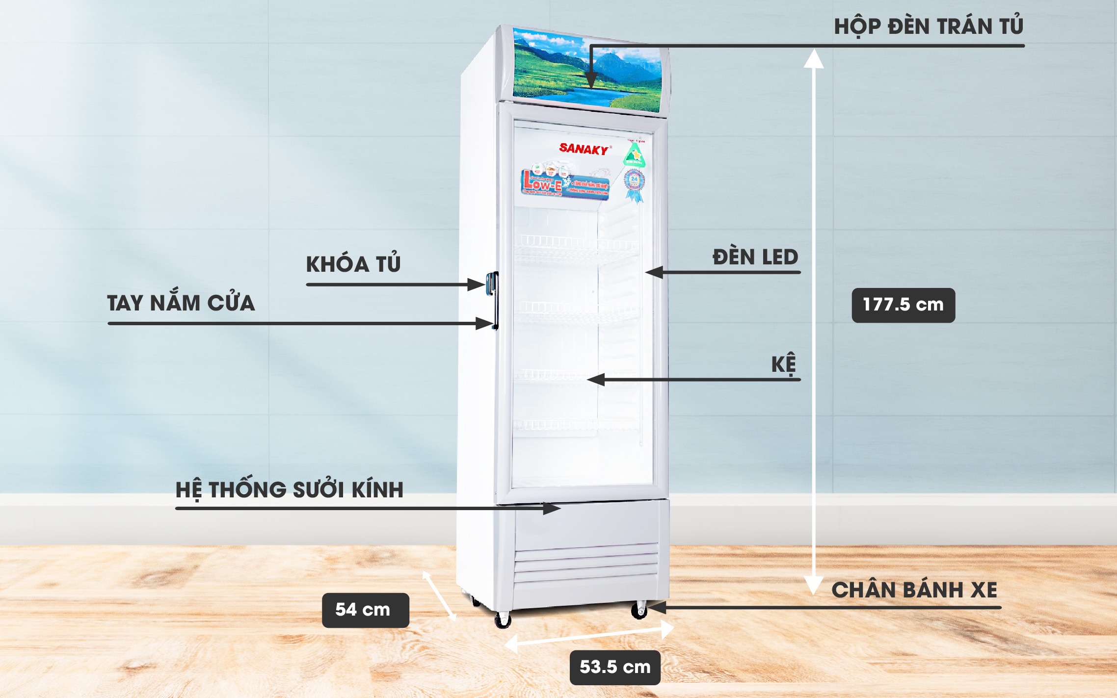 - Tủ mát Sanaky VH-258K3L sử dụng công nghệ đèn LED tiết kiệm điện chiếu sáng dọc bên hông tủ. Đèn pano quản cáo trên đầu giúp tủ sang trọng nổi bật.